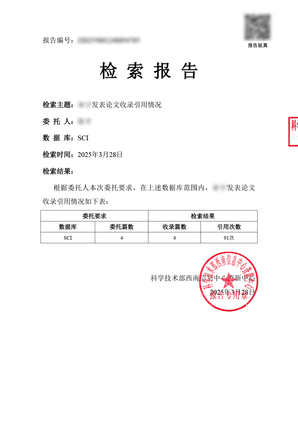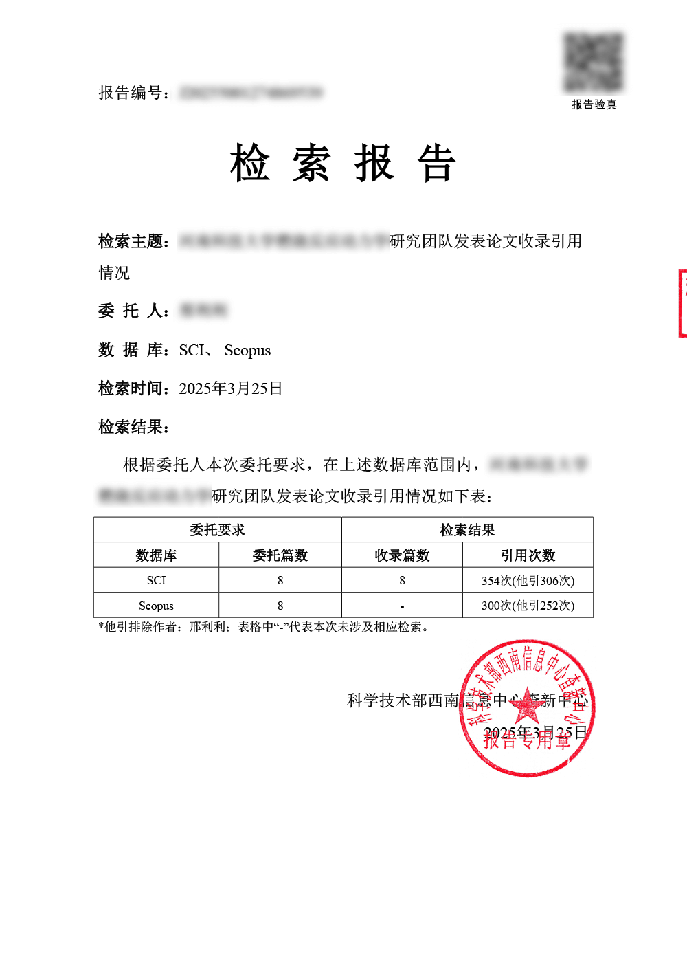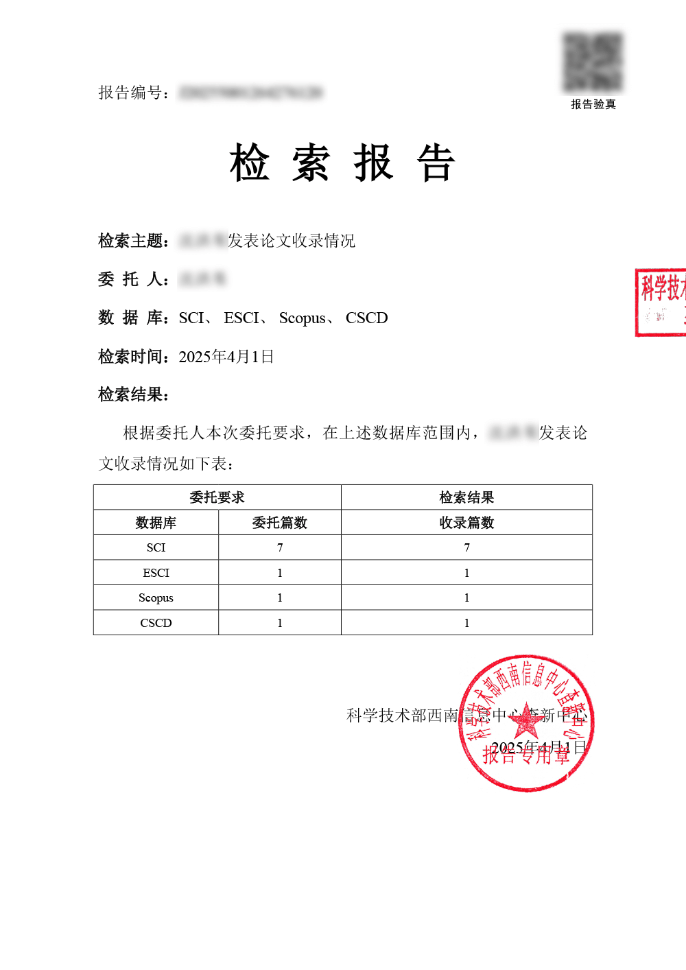 根据文献被数据库收录和引用情况,出具检索报告